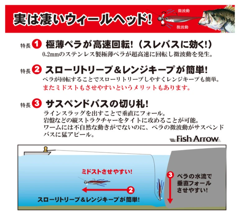 Angenommen als „Feco“ zertifiziertes Produkt, gesponsert von JB und NBC (Japan Bass Producers Association)! Revolutionärer Jigkopf, der sowohl beim Fallen als auch beim Schwimmen automatisch Fische anlockt! Dieser Jigkopf mit Propeller (PAT.P) kann in allen Tiefen und sogar in Deckung verwendet werden.Passend für Jigs zwischen ca. 7 cm und 11 cm!