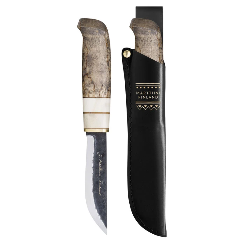 Das Modell vereint die Eigenschaften zweier traditionell schwerer Messer: die Klinge des klassischen Lappmessers mit dem Griff des Lynx-Messers. 11 cm lange Klinge aus rostfreiem Stahl. Die Gesamtlänge des Messers beträgt 23 cm. Der Griff ist aus teergewachster Masur-Birke und Rentierhorn, das mit einem Schutzöl behandelt wurde.Aapa Carbon von Marttiini ist ein unglaublich feines Stück Handwerkskunst, verpackt in einem schönen Messer. Schwarze Lederscheide mit goldenen Details.